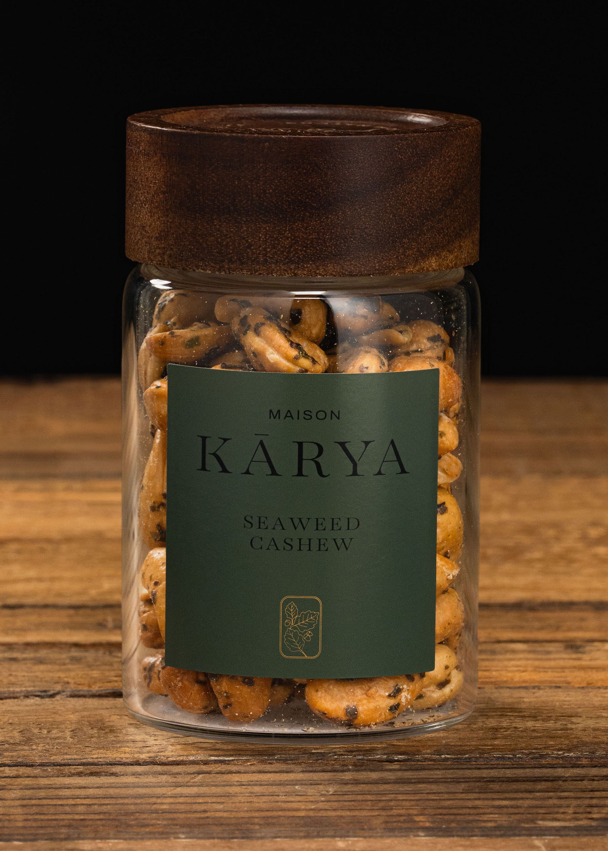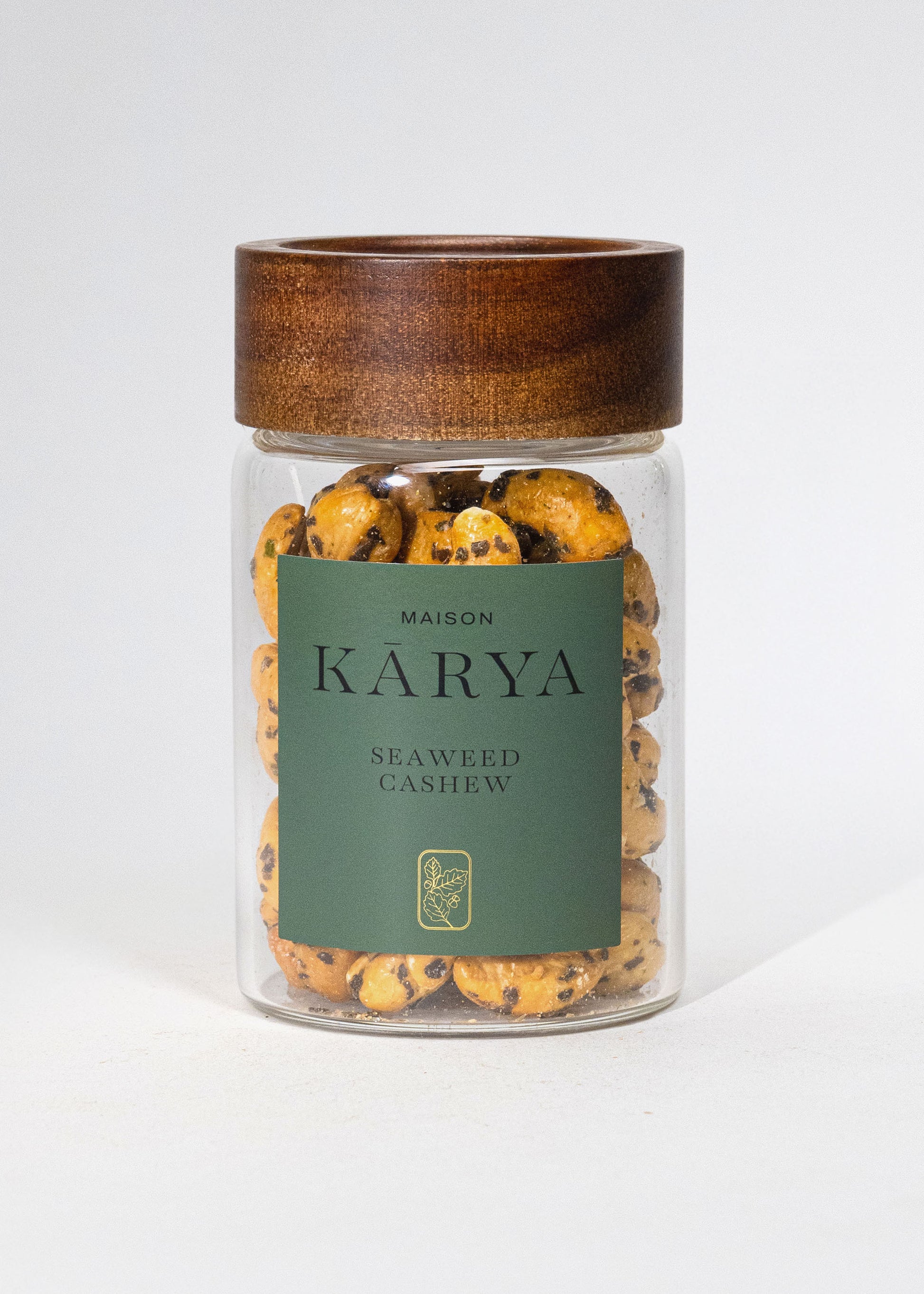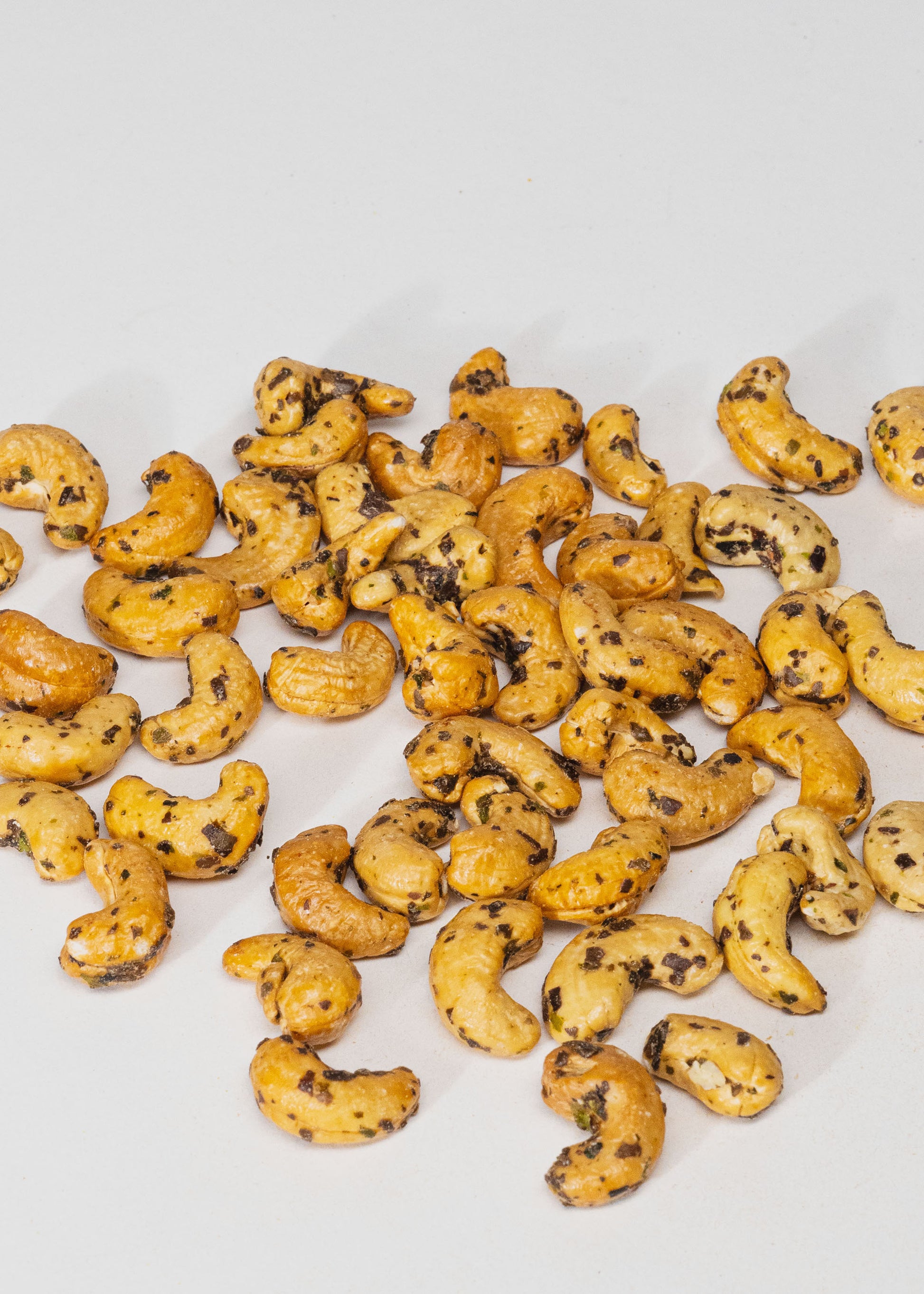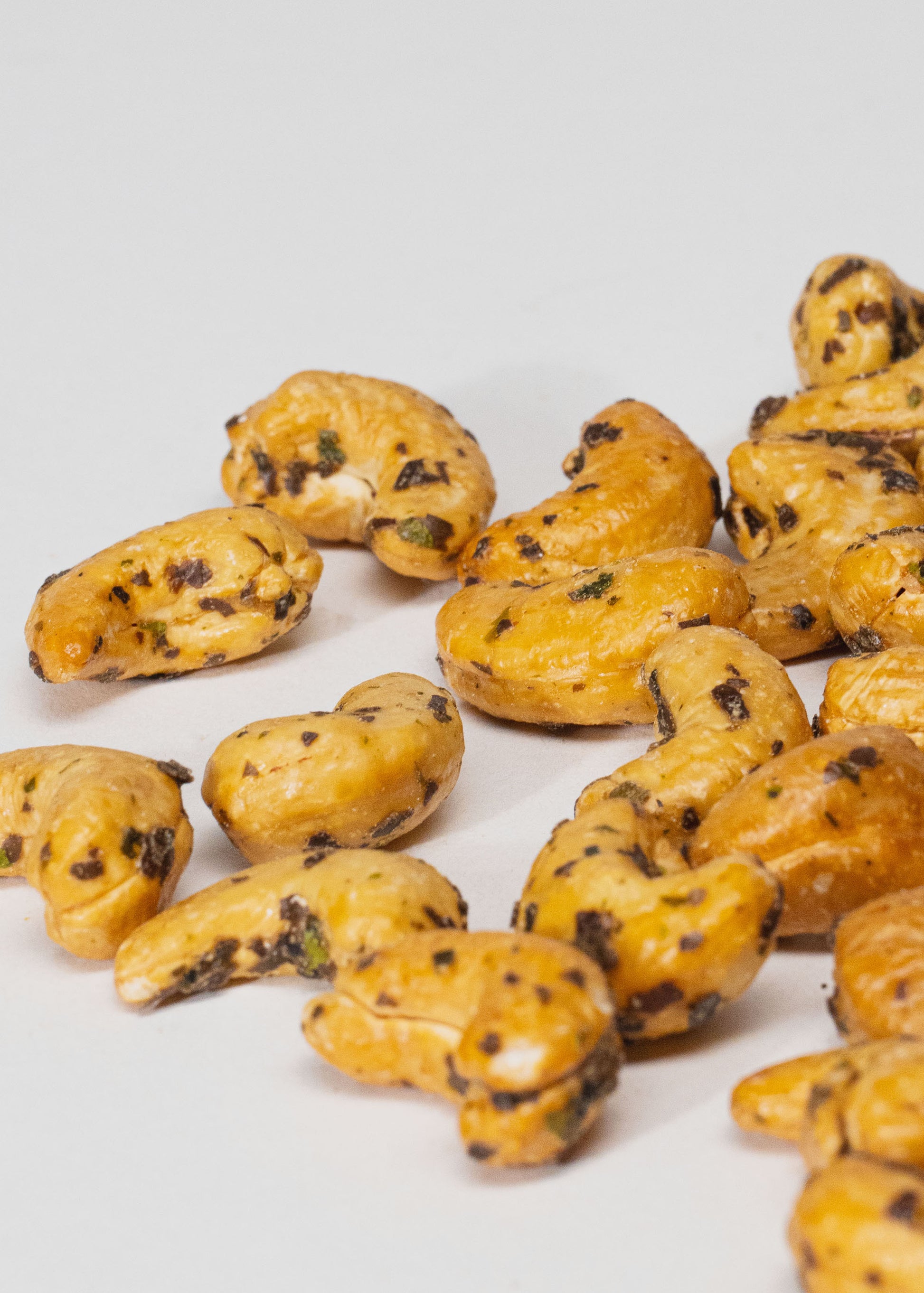 烤腰果包裹鹹香海苔,散發淡淡鮮味。腰果富含必需礦物質和健康脂肪,海苔則天然蘊含碘和微量礦物質,有助於甲狀腺功能和整體活力。一款時尚、營養豐富的零食。